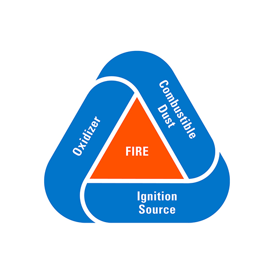 3. Understand the fire triangle and explosion pentagon. For a fire to occur, three key elements need to be present: oxygen, heat, and fuel. Remove one of these elements, and the risk is eliminated. For an explosion, five elements must combine — those necessary for a fire plus two others: dispersion (dust suspended in factory air) and confinement (dust concentrated in a small space). To mitigate an explosion risk, strive to remove one or more of these five elements. Removing any element of the fire triangle will prevent an explosion as well, but the inverse is not true: just eliminating dust dispersion or confinement is not enough to prevent a fire, so efforts need to focus on both hazards.