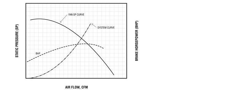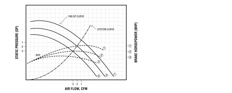 If the system has not been measured, a fan curve is not available, or the system flow is variable, the most efficient solution is likely a Variable Frequency Drive (VFD). A VFD can provide an infinite number of fan SP curves and corresponding bhp curves as shown in Figure 11. By simply dialing in the speed that gives desired flow, you can reap the benefits of the changes in brake horsepower.