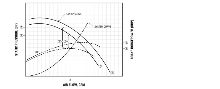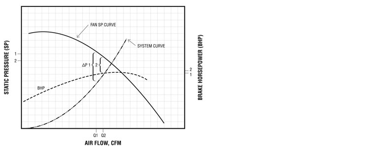 If the design airflow is Q1 with a design ∆P1 and high-performance filter bags are installed that operate at a reduced pressure drop ∆P2, the static pressure at the fan inlet is reduced to SP1, resulting in an increased flow Q2 and an increase in horsepower bhp2 in Figure 8. A mechanical change in the fan system is required to return the flow to the design flow Q1.