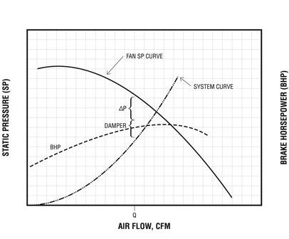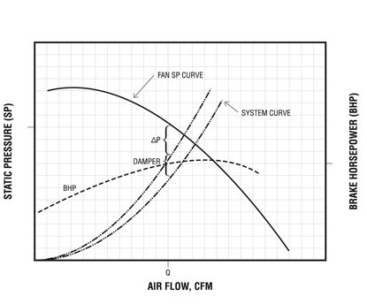 One way to reduce the airflow to the original Q2 value, is to simply close a damper to replace the static resistance as illustrated in Figure 9. That reduces the airflow to the original level, but it also returns the bhp to the original level. In effect, the damper is creating a new system curve as shown in Figure 10. This does not accomplish the objective of reducing energy.