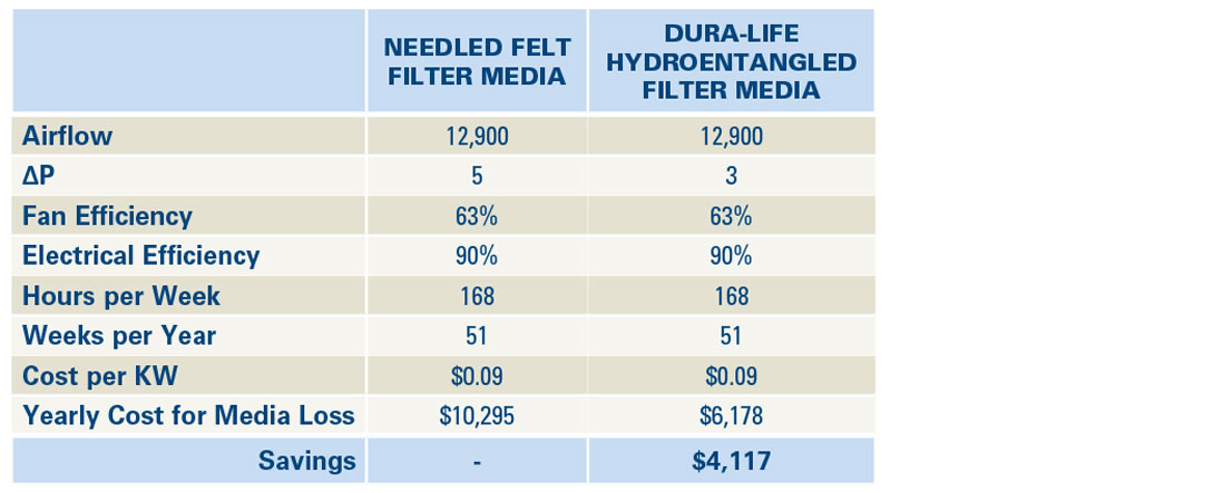 By simply purchasing and installing the hydroentangled bag filters and re-sheaving for a lower speed, the facility determined they could potentially save over $77,000 a year if all 35 dust collectors were retrofitted.