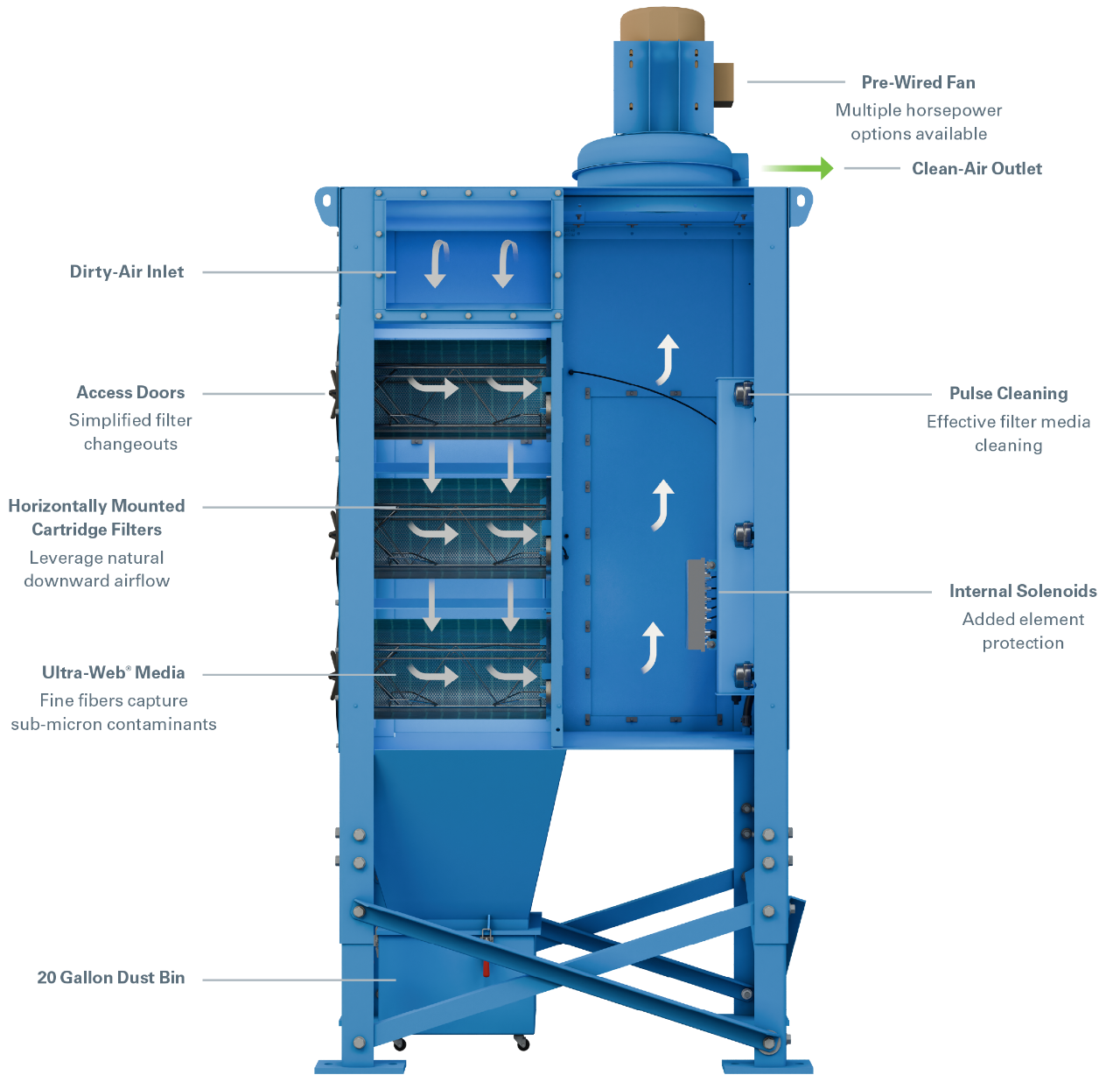 我们的水平安装三角形过滤器采用行业领先的 Ultra-Web® 精细纤维技术制成,滤芯底部有更多滤料,因此脉冲清洁能量将喷出的灰尘引导到其最终目的地——密封容器。
