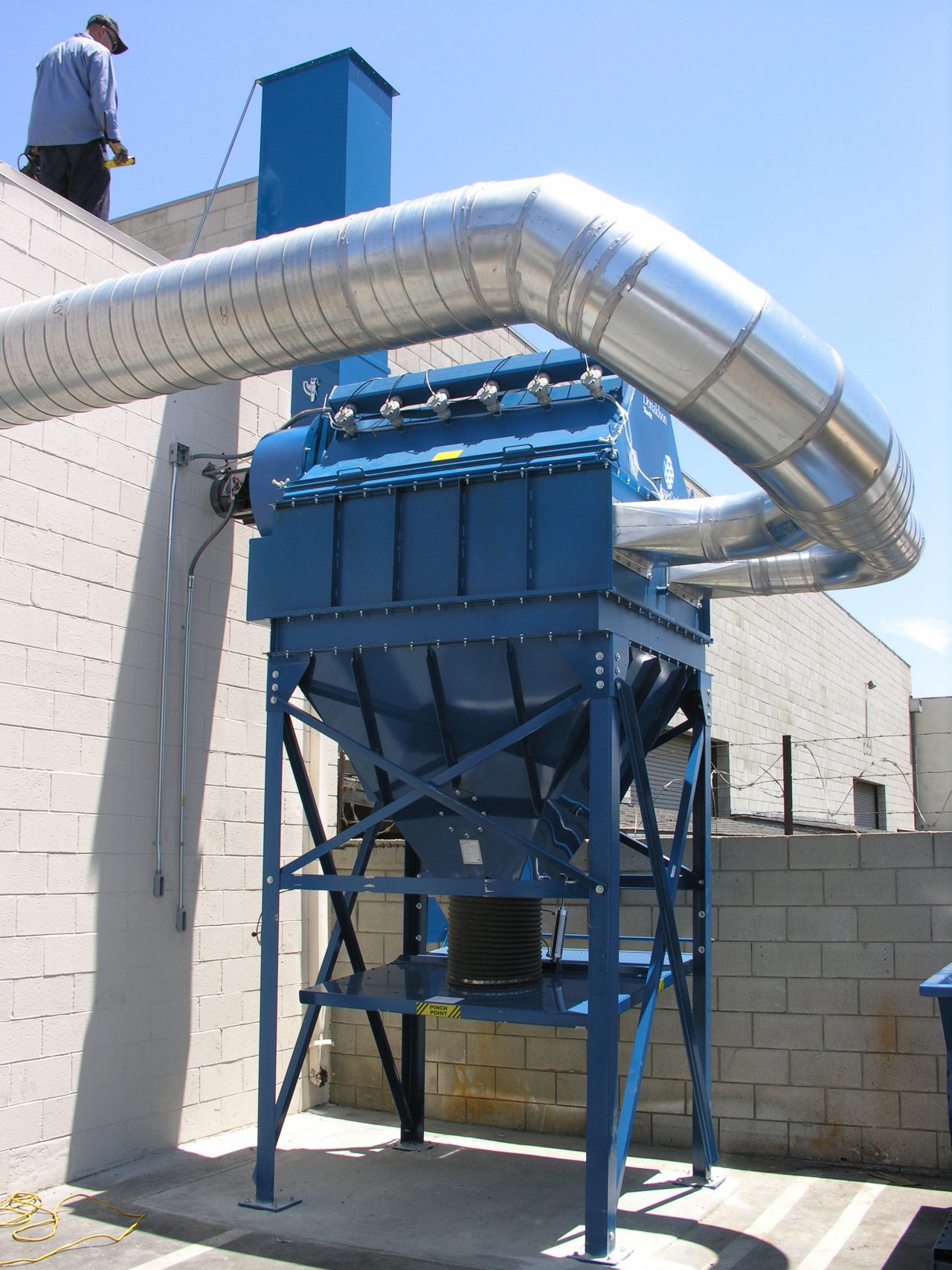 Schervone 选择了 PowerCore® 型号 CPC-12,该型号的气流设计为 7,000 cfm,风扇功率为 20 马力。该除尘器包含 12 个 PowerCore 滤芯组,各滤芯组尺寸仅为 7"D x 22"L。过滤间高 4 feet 英尺(1 英尺 = 0.30 米),位于支腿和灰斗上,总高度为 12 feet 英尺(1 英尺 = 0.3048 米)。清洁空气出口上方装有一个小型消音箱。相比之下,具有 7,000 cfm 立方英尺/分钟(1 立方英尺 = 0.0283 立方米)气流的传统袋式除尘器高度将超过两倍 - 28 feet 英尺(1 英尺 = 0.3048 米)高 - 配有 81 个滤袋,每个滤袋长 8 feet 英尺(1 英尺 = 0.3048 米)。