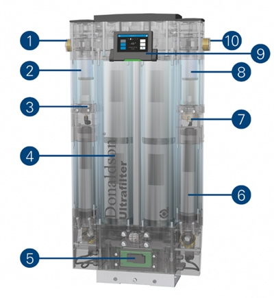 本系统中使用的滤芯可在低过滤压差下实现高效过滤性能。压缩空气进入部件时,首先通过预过滤滤芯有效分离或截留空气中的液体和固体颗粒杂质,然后再进入两个吸附剂筒中的其中一个。后置过滤器可去除低至 0.01 μm 的固体颗粒。
