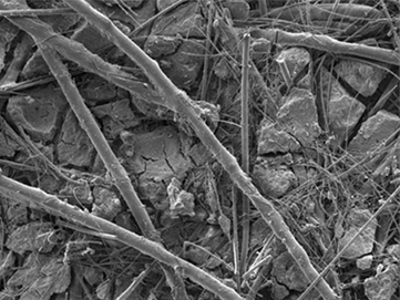 进气口滤芯滤料通常采用纤维素纤维或纤维素合成混合物制成。唐纳森 Ultra-Web® 技术等最新技术采用通过静电纺丝工艺制备的精细纤维滤料,该工艺可生产直径为 0.2 到 0.3 micron 微米的连续、弹性合成纤维。Ultra-Web 形成的精细纤维层中纤维间距极小,使粉尘只能滞留在滤料表面,如图 4 所示。