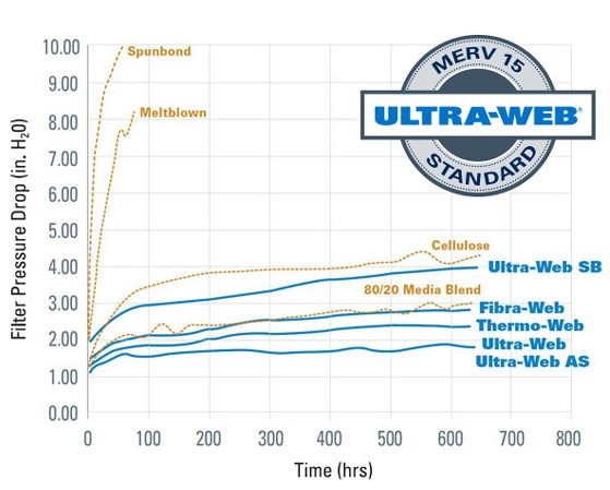 Ultra-Web MERV 14 和 15 的效率已通过独立实验室根据 ASHRAE 52.2-2007 标准进行的测试认证,这是行业目前所接受用于评估滤芯性能的新测试方法。