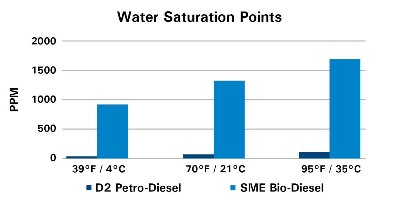 - 饱和度范围从 50 到 1800 ppm 不等,具体取决于温度和生物柴油含量